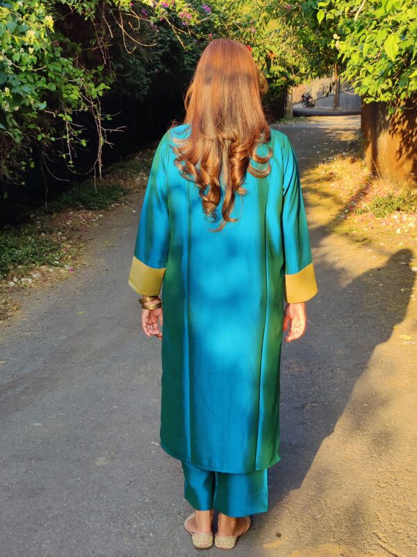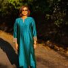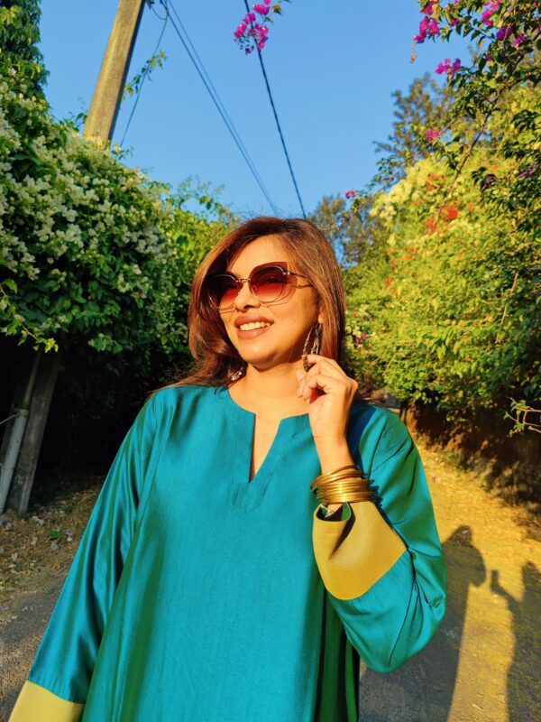 The relaxed-fit kurta ensures ease of movement and offers ample room for layering. It features a sharp notched neckline for a clean, professional look, along with 3/4th sleeves finished with minimalist yet elegant detailing.