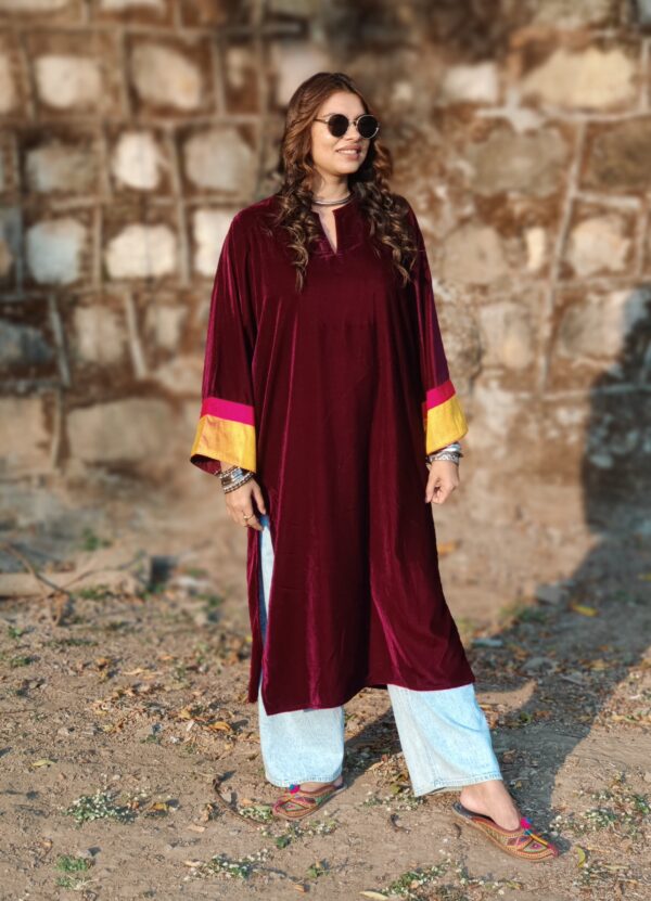 This Kashmiri-inspired Pheran is crafted from Premium Velvet, featuring a relaxed, anti-fit silhouette designed for maximum comfort. Adorned with an elegant notched neckline and stylish Bell Sleeves with 100% Pure Silk sleeve detailing that enhances its overall elegance. Thoughtfully designed with two deep pockets for functionality.