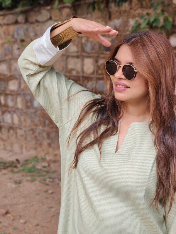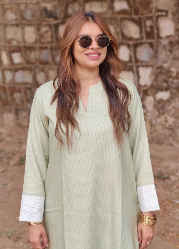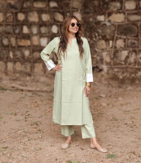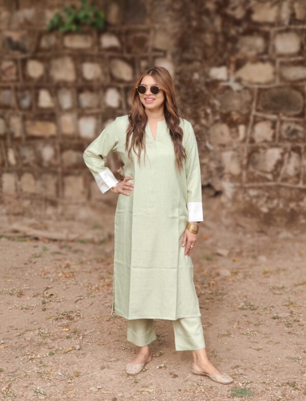 - Relaxed-fit kurta paired with straight-fit pants for effortless comfort and everyday elegance.